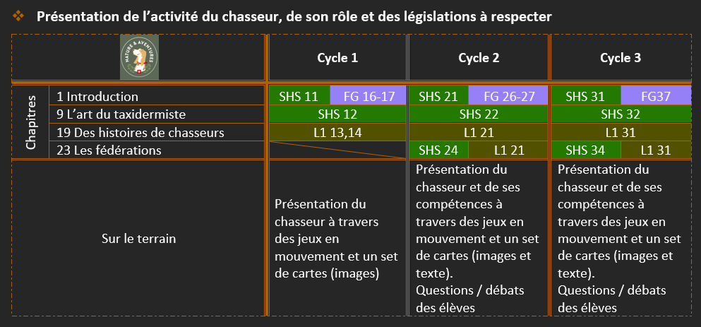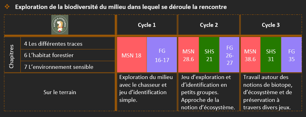 Un socle commun de deux petites activités est proposé lors de chaque sortie, en lien avec l’activité du chasseur et la biodiversité. Une troisième activité plus conséquente sera ensuite réalisée, selon le thème sélectionné par l’enseignant (voir Thèmes à choix).