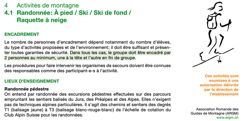 Dans le canton de Vaud, le document « Guide des mesures de sécurité », du service de l’éducation physique et du sport, fait foi.