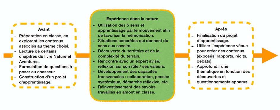 Inspirée des pratiques et théories actuelles dans le domaine de l’enseignement en extérieur, notre approche se focalise sur le développement d’une riche expérience pour les élèves lors de la sortie avec le chasseur. Un soin particulier est porté sur l’intégration de cette expérience au sein d’une séquence d’enseignement de qualité, afin de donner du sens aux contenus explorés et de créer de réelles synergies entre les situations vécues à l’extérieur et les compétences travaillées en classe.