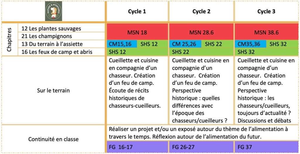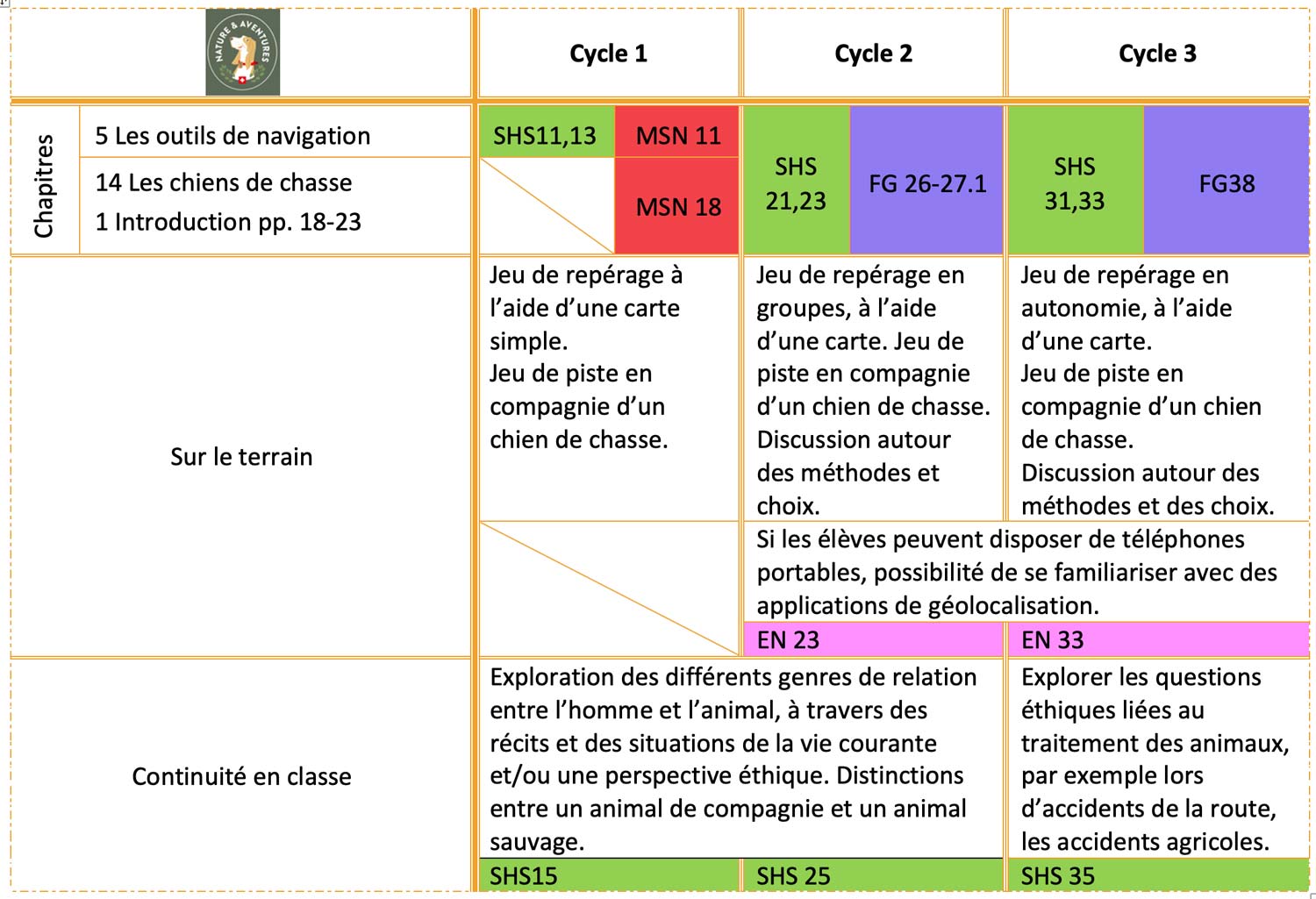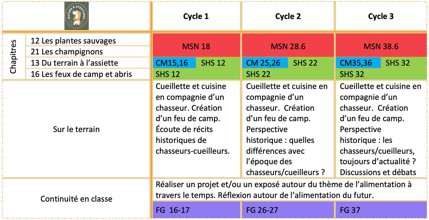 Chaque activité est liée avec plusieurs chapitres du livre Nature & Aventures et les compétences du Plan d’Études Romand (PER), classées en 6 domaines :