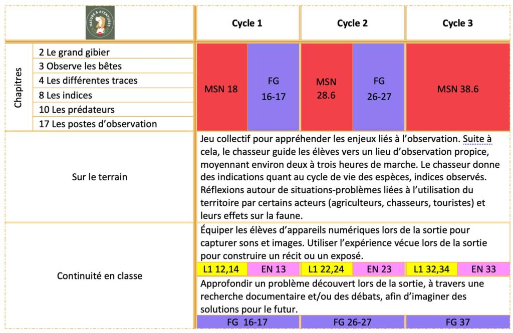 Les chasseur animateurs et les enseignants se coordonneront pour déterminer ensemble une date et un lieu pour la sortie (une date de réserve en cas de mauvais temps). Ce sera aussi l’occasion de vérifier les attentes de l’enseignant et de discuter plus concrètement des détails d’organisation (horaire, matériel, transports, etc…). Les frais de transports ne sont pas compris dans le prix de la sortie, mais sont à la charge de l’établissement scolaire. C’est donc à l’enseignant de s’organiser par rapport à cela avec sa direction. Ainsi que l’achat éventuel du livre Nature & Aventures si la bibliothèque scolaire ne l’a pas déjà.